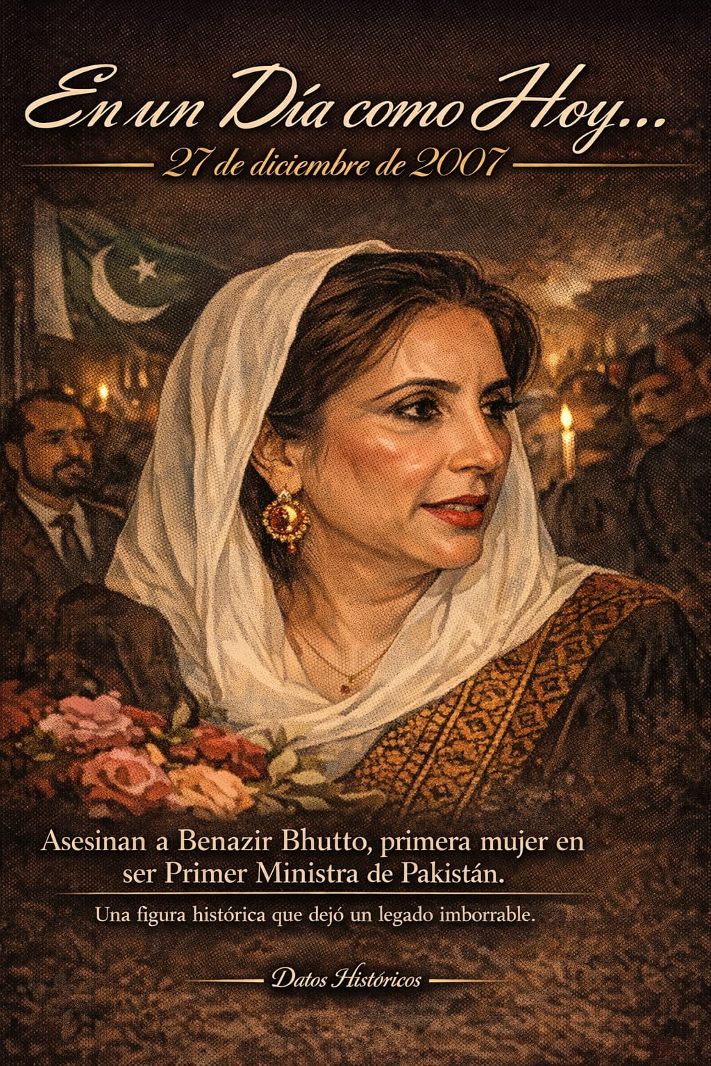 Asesinato de Benazir Bhutto en 2007, primera mujer en gobernar Pakistán y figura clave de la política del sur de Asia.