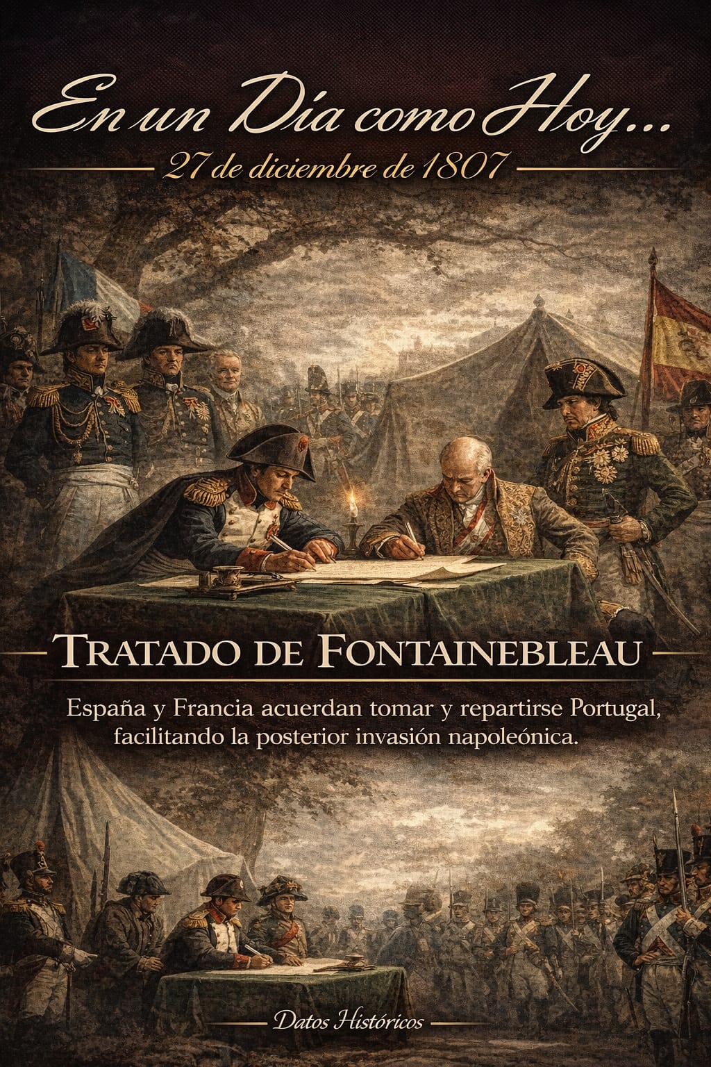 Firma del Tratado de Fontainebleau en 1807 entre Francia y España, que permitió la invasión napoleónica de Portugal.