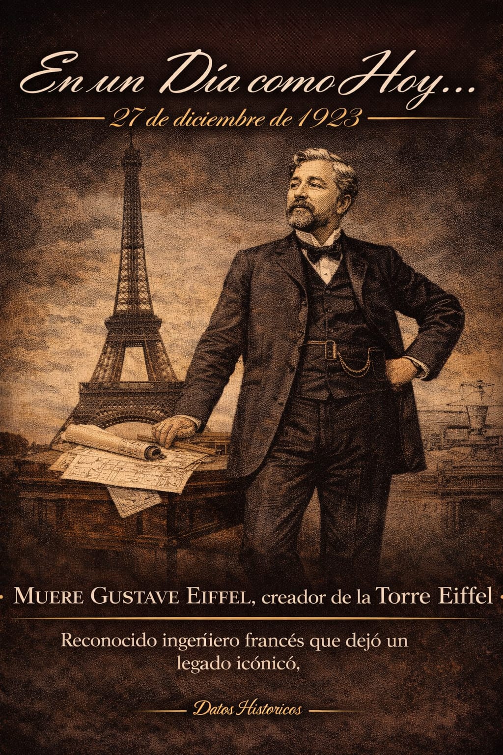 Muerte de Gustave Eiffel en 1923, ingeniero francés creador de la Torre Eiffel y pionero de la arquitectura metálica.
