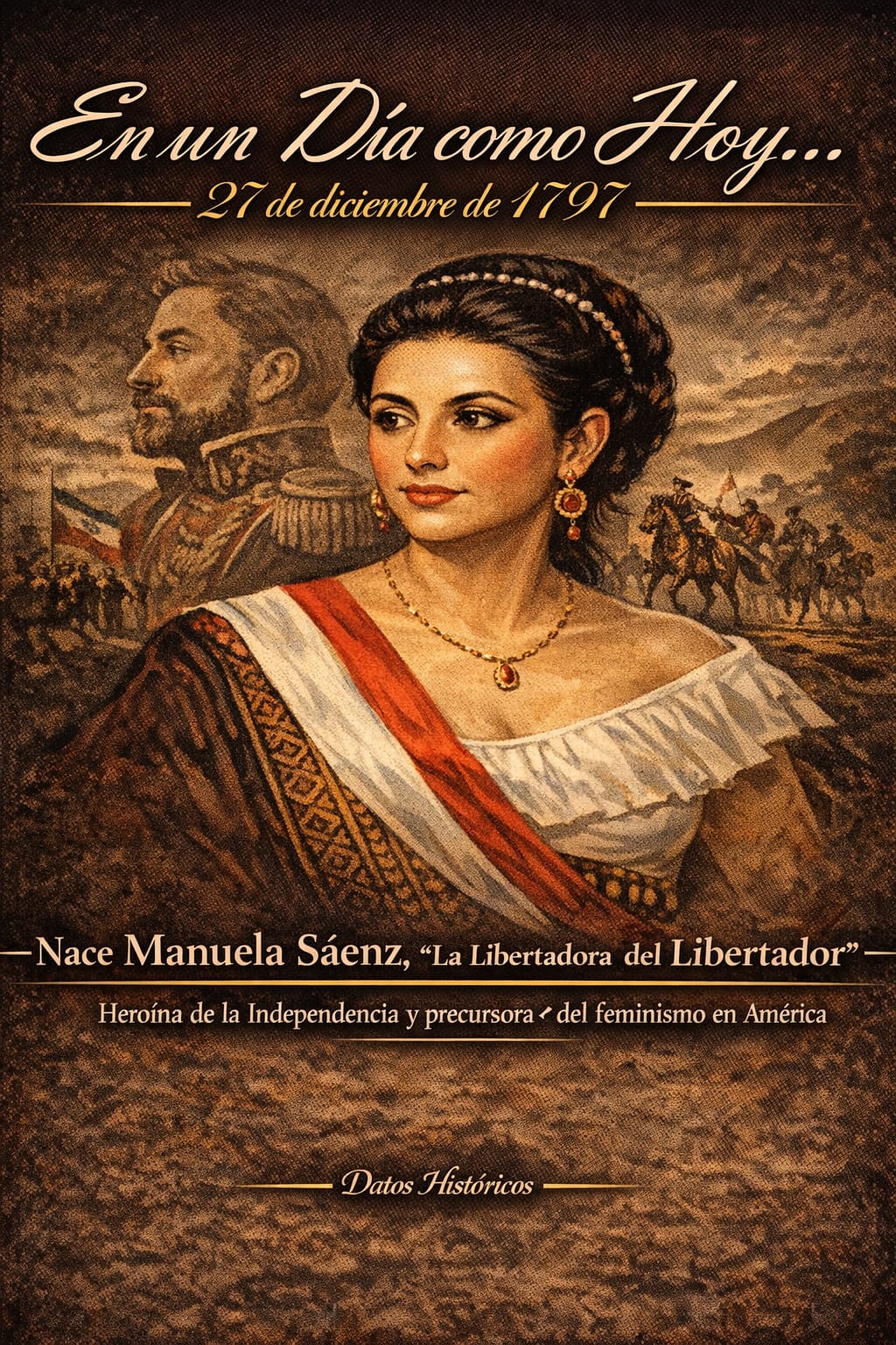 Nacimiento de Manuela Sáenz en 1797, heroína de la independencia latinoamericana y figura clave en la historia de América.