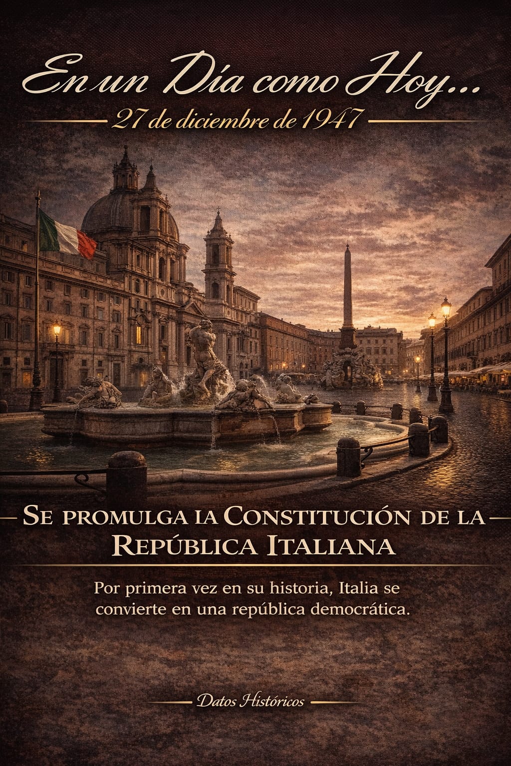 Promulgación de la Constitución de la República Italiana en 1947, que establece a Italia como una república democrática tras la Segunda Guerra Mundial.
