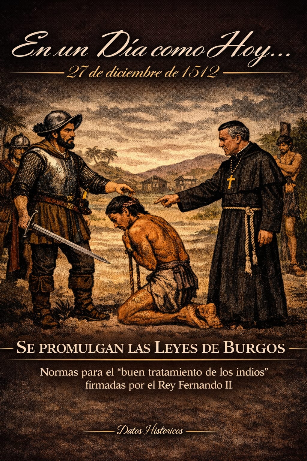 Promulgación de las Leyes de Burgos en 1512, primeras normas de la Corona española sobre el trato a los pueblos indígenas en América
